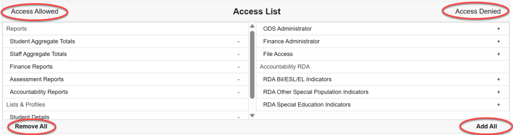 Access List – List of available Access Privileges that can be assigned by the system administrator by clicking on individual items or Add all at bottom of box. Items on the left are accessible; items on the right are not.