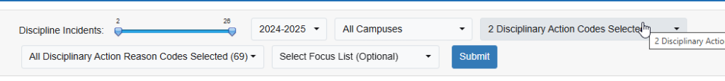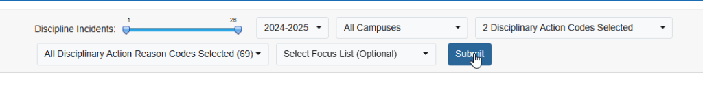 Return the incident number range filter to 1 and keep Discipline Action code selection the same.