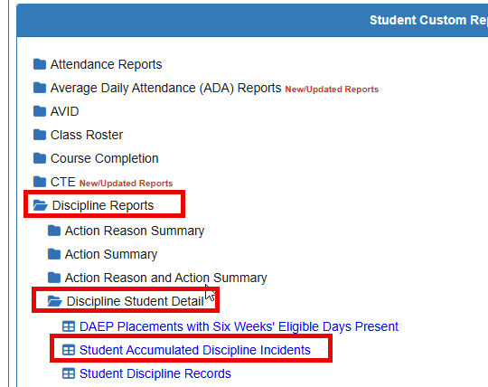 However, this may be used for any disciplinary action. This can be determined using the Student Accumulated Discipline Incidents report located under Student>Discipline Reports>Discipline Student Detail
