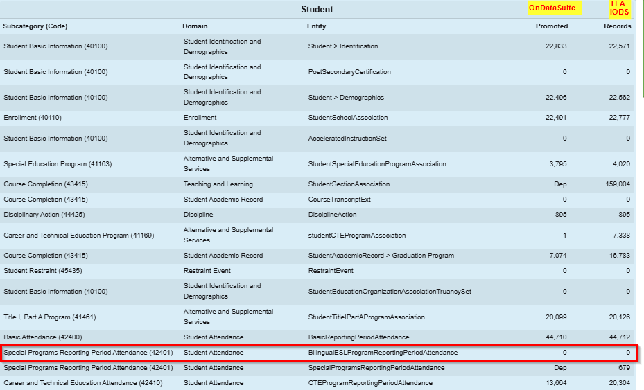 - Summer PEIMS promotion related to the Bilingual/ESL Funding Code changes released to accept the new codes from the TEA IODS in your nightly pull. However, reporting is impacted across the OnDataSuite system and we are working on the respective reporting areas.