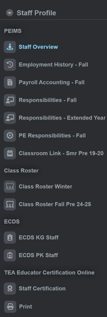 - Displays PEIMS Fall staff data in the 30090 responsibility records