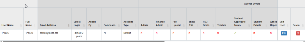 Upon selecting the agreement to the TASBO partnership, a new user will be created with default permissions detailed below.  At any time, the district can choose to modify those permissions by selecting the EDIT button.