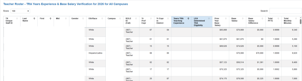 As of October 28, 2025: NEW Teacher Roster – TRA Years Experience & Base Salary Verification (Released under Staff > Teacher Retention Allotment (TRA) Reports)and includes the new Fall Staff TRA elements once LEAs/Vendors are publishing these new elements to the TEA IODS. For full details on the report and utilization reference the Report Notes: https://kb.ondatasuite.com/knowledge-base/teacher-roster-tra-years-experience-base-salary-verification/