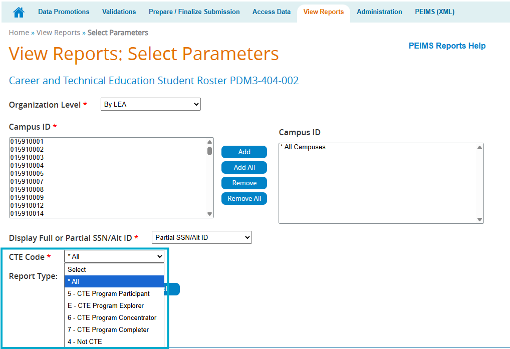 - Student Report Center>TEA CTE Code and TEA Program of Study in the Course Completion, CTE Attendance Multiplier, and the Summer Enrollment categories